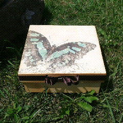 Caixa de Madeira com fita de cetim, laço e brad, forrada com papel de scrapbooking.